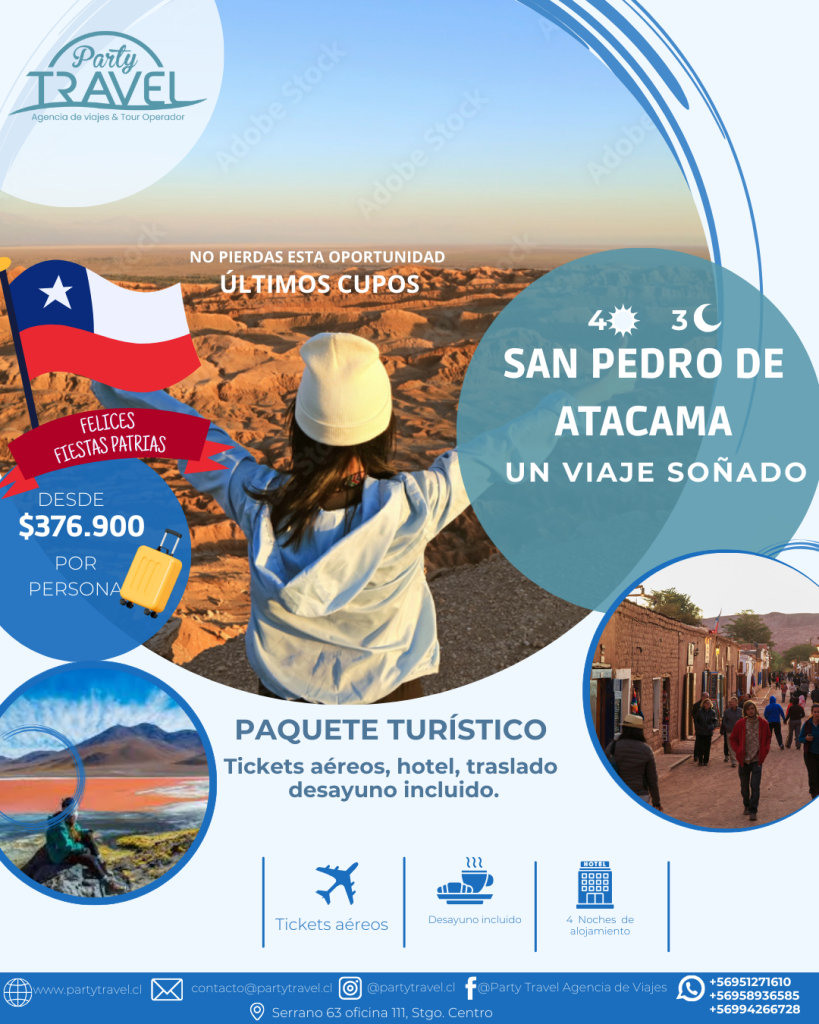Cuatro días en la precordillera en uno de los destinos más importantes a nivel nacional y continental, donde conoceremos atractivos como los maravillosos Valle de la Luna, los sorprendentes Geysers del Tatio, las Lagunas Altiplánicas, el Valle Arcoíris, la novedosa Laguna Céjar y los Ojos del Salar y un fuerte atacameño de más de 800 años como lo es el Pukará de Quitor. Además, conoceremos los poblados de Tulor, Machuca, Socaire. Acompáñanos!!